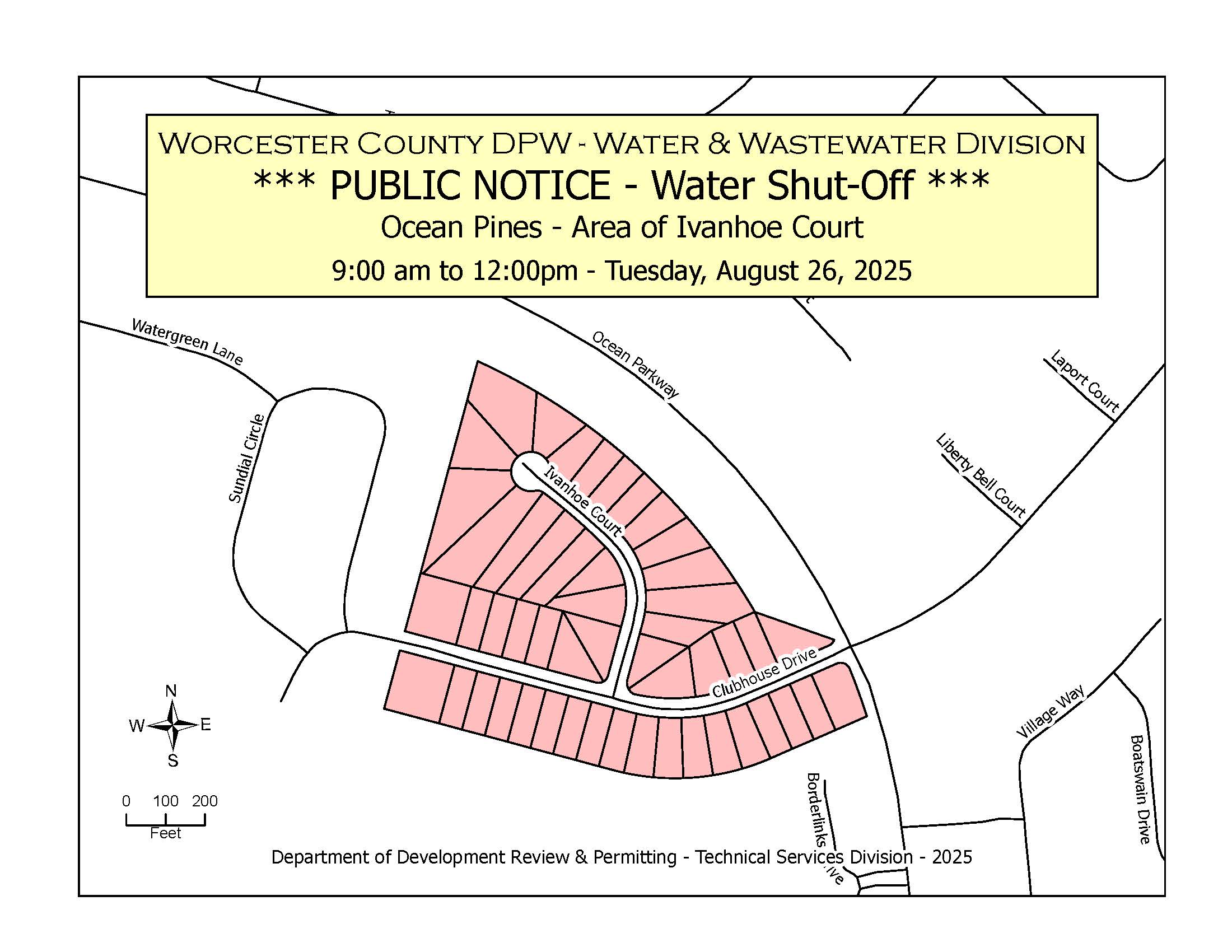 There will be a temporary water outage while crews replace a water service line in the area of 22 Ivanhoe Court on Tuesday, August 26, from 9:00 a.m. to 12:00 p.m. This outage will impact roughly 50 homes in the vicinity of the intersection of Clubhouse Drive and Ocean Parkway to the intersection of Clubhouse Drive and Sundial Circle and all of Ivanhoe Court.