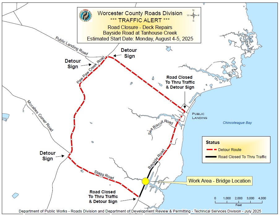 Wed.-Thurs., July 30-31, Bayside Road in Public Landing will be closed while crews replace some of the wood bridge decking boards that have become cracked, decayed, or warped. For more information, contact the Roads Division at 410-632-2244.
